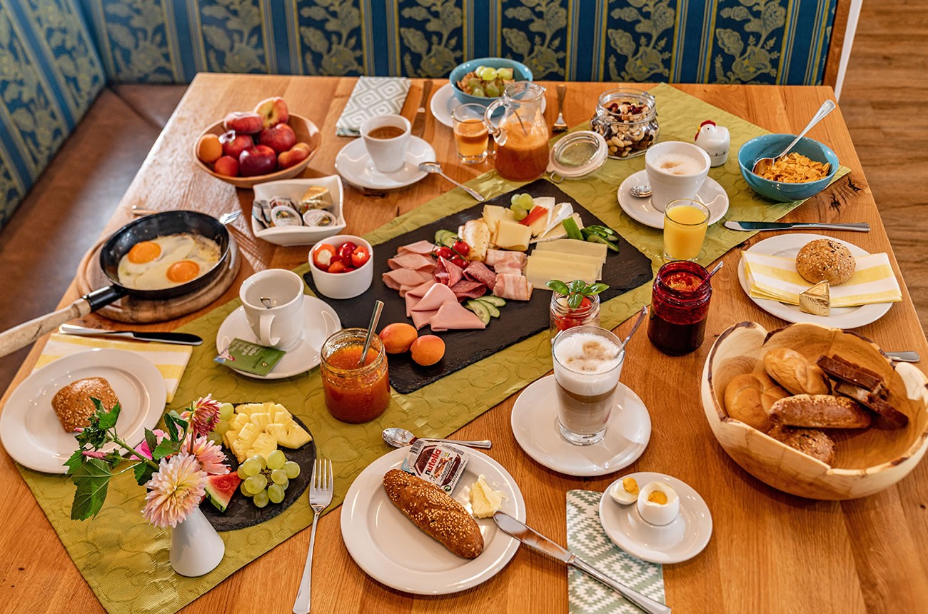 Beim Aufwachen schon an das Frühstück denken! Kaffeegeruch, der in die Nase steigt. Beim Geruch von frisch zubereiteten Spiegeleiern fängt der Magen zu knurren an. Wer kennt das nicht? Der große Vorteil im Urlaub ist ja, dass man sich einfach an den gedeckten Frühstückstisch setzen kann. Nachdem man den ersten Schluck Kaffee zu sich genommen hat, schlendert man gemütlich zum Frühstücksbuffet, welches von 7.30 Uhr bis 10.00 Uhr im Hotel Die METZGERstub'n 3*S für Sie bereit steht. Für alle Frühaufsteher gibt es von 6.00 bis 07.30 Uhr ein herzhaftes „Jaga-Frühstück“.